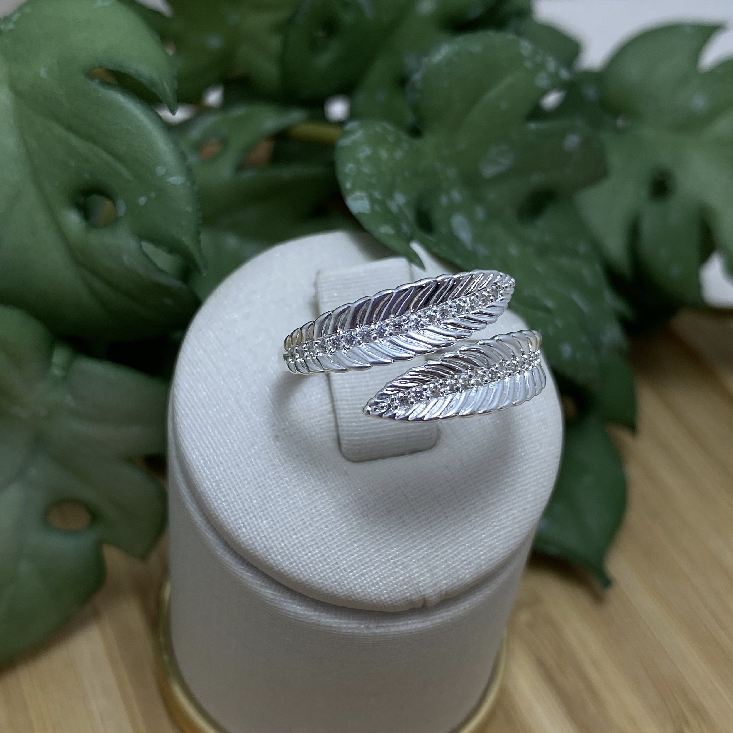 Delicado Anel banhado a Prata 925, com 2 Folhas opostas com zircônias cristal.