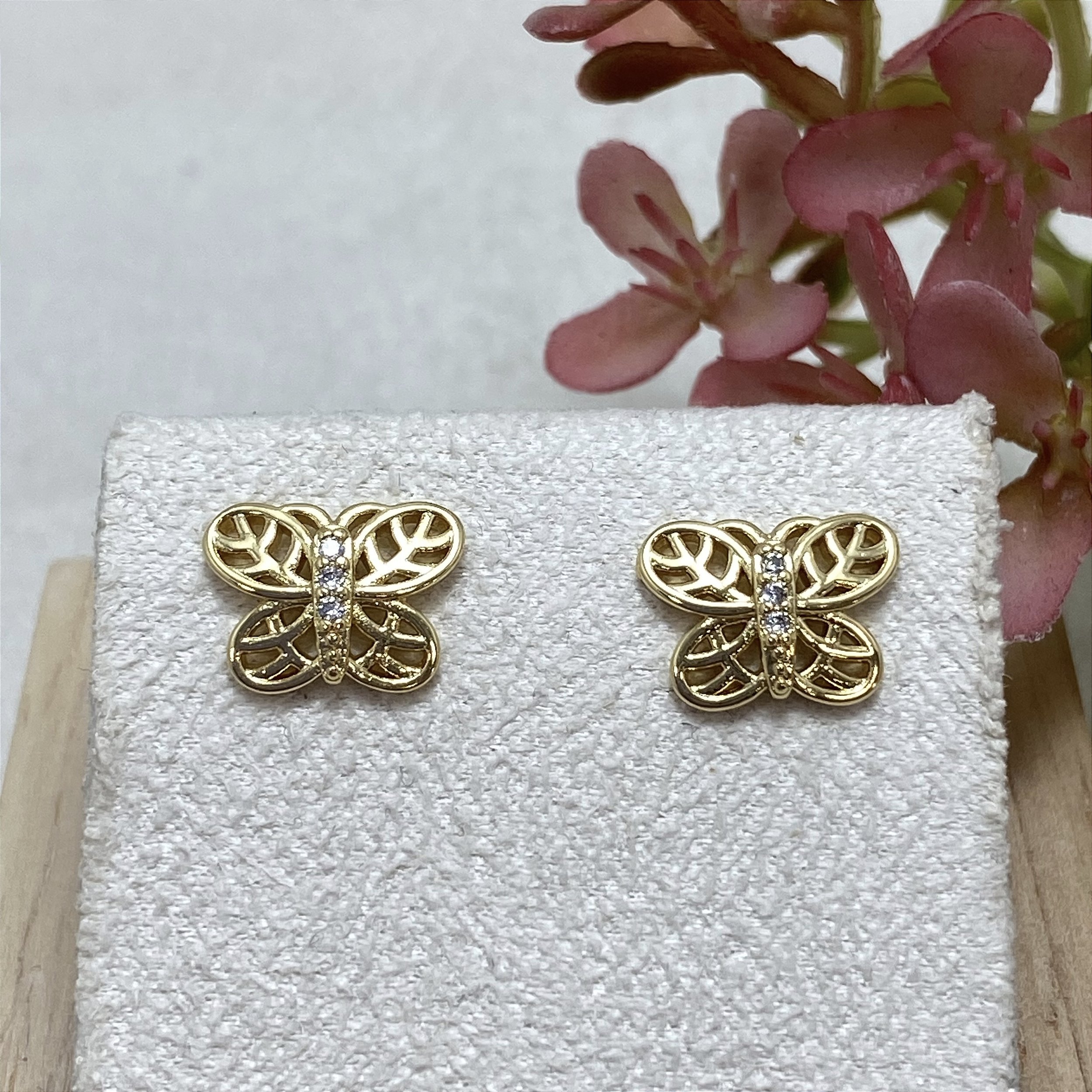 Brinco banhado a Ouro 18k, em forma de borboleta vazada com zircônias.