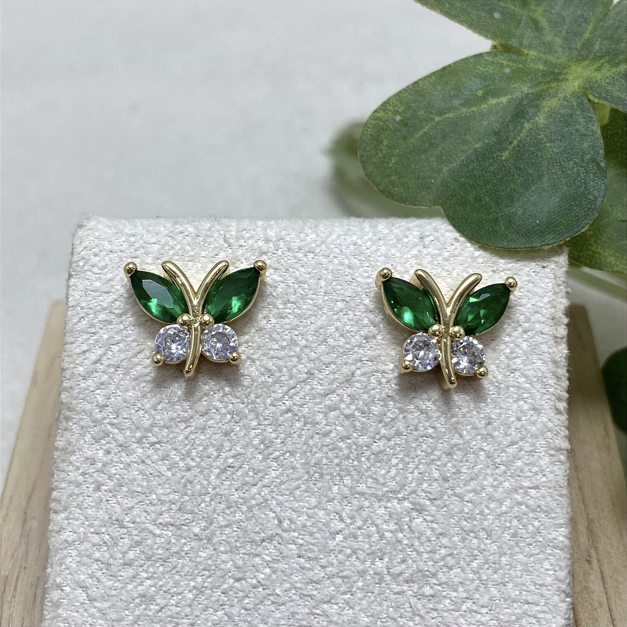 Brinco banhado a Ouro 18k, em forma de borboleta com cristais verdes e zircônias cristal.