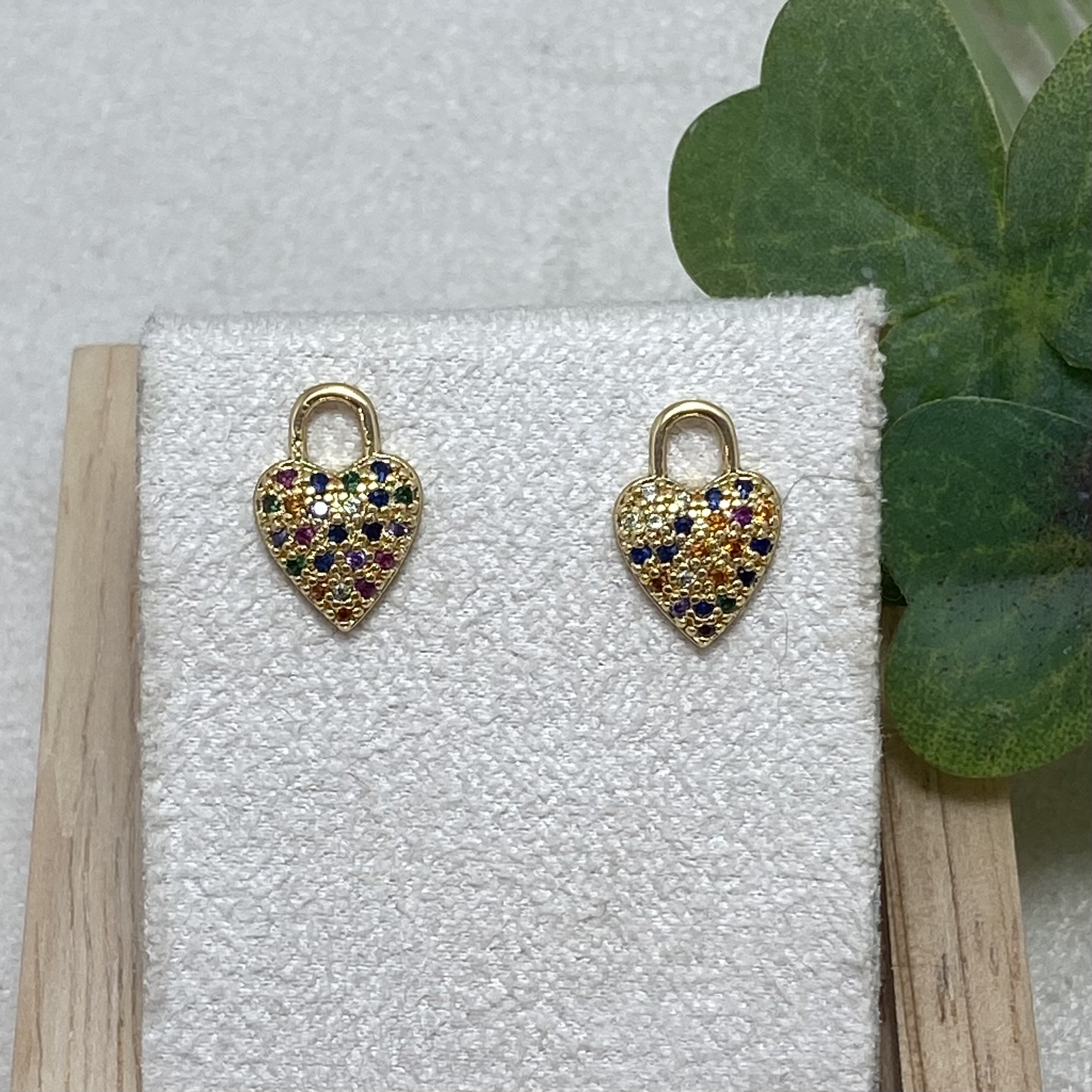 Brinco banhado a Ouro 18K, em forma de Coração-Cadeado, todo cravejado de zircônias coloridas.