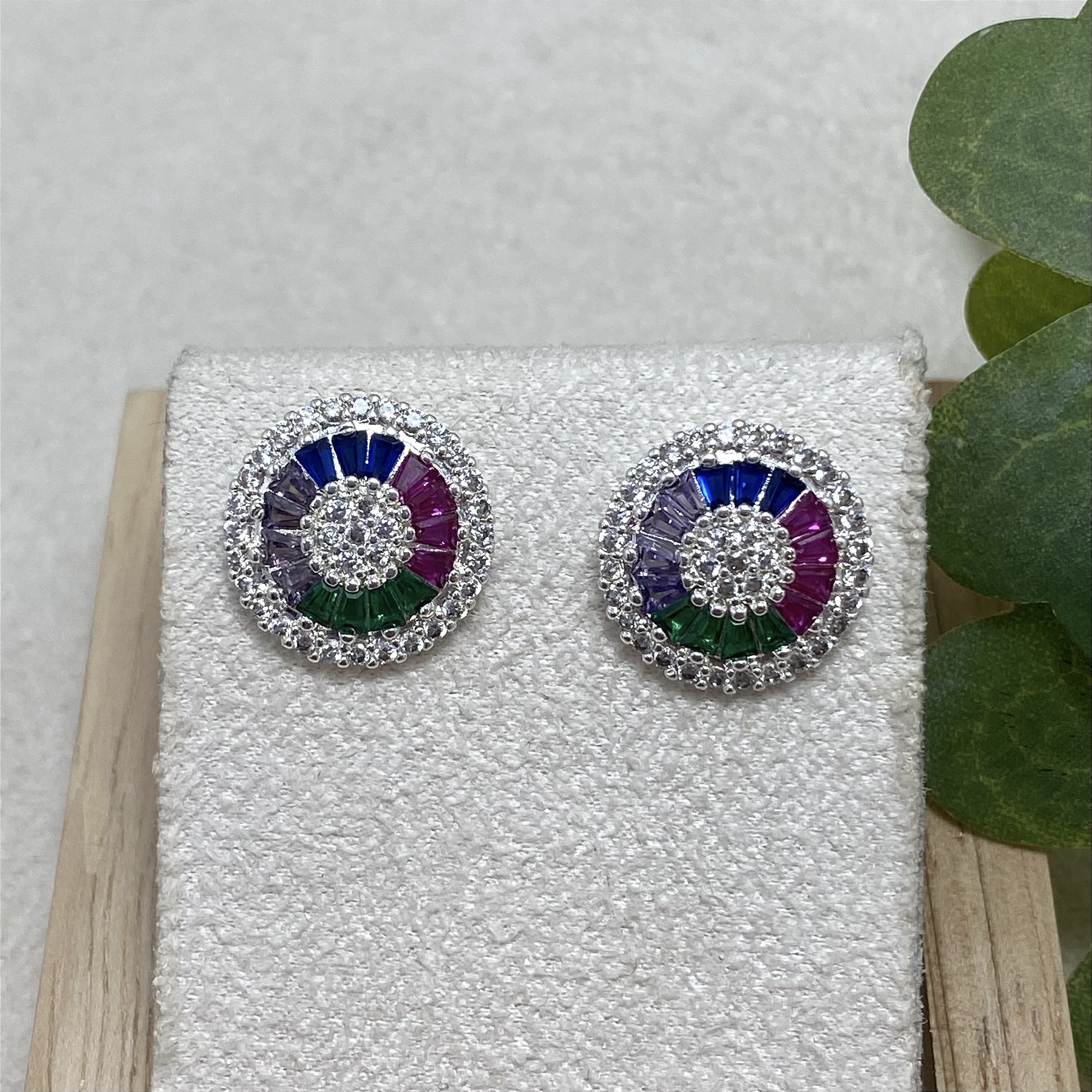 Brinco banhado a Prata 925, redondo, cravejado de Zircônias Coloridas.