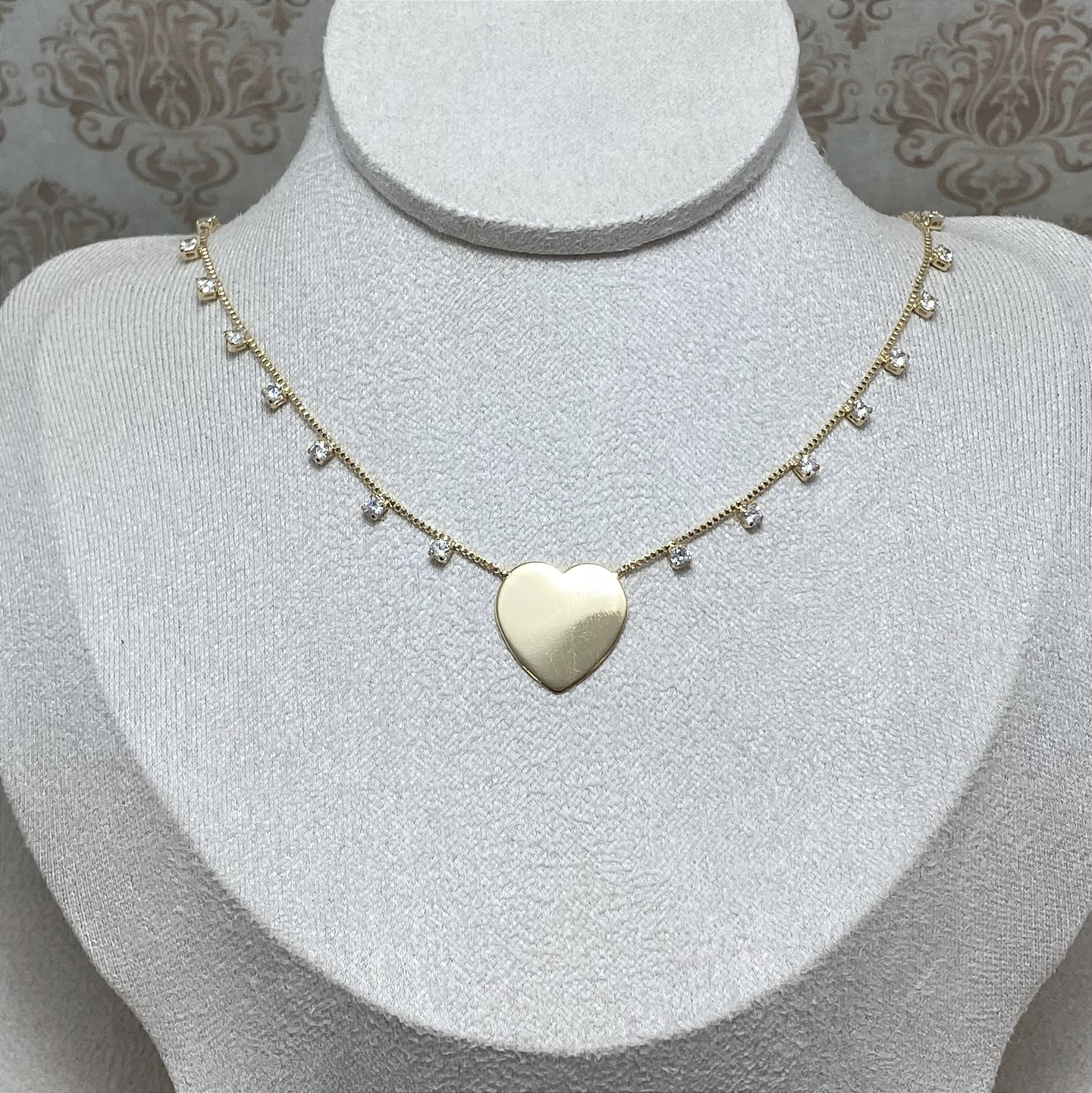 Colar banhado a Ouro 18k, com coração liso e vários pontos de zircônia cristal.