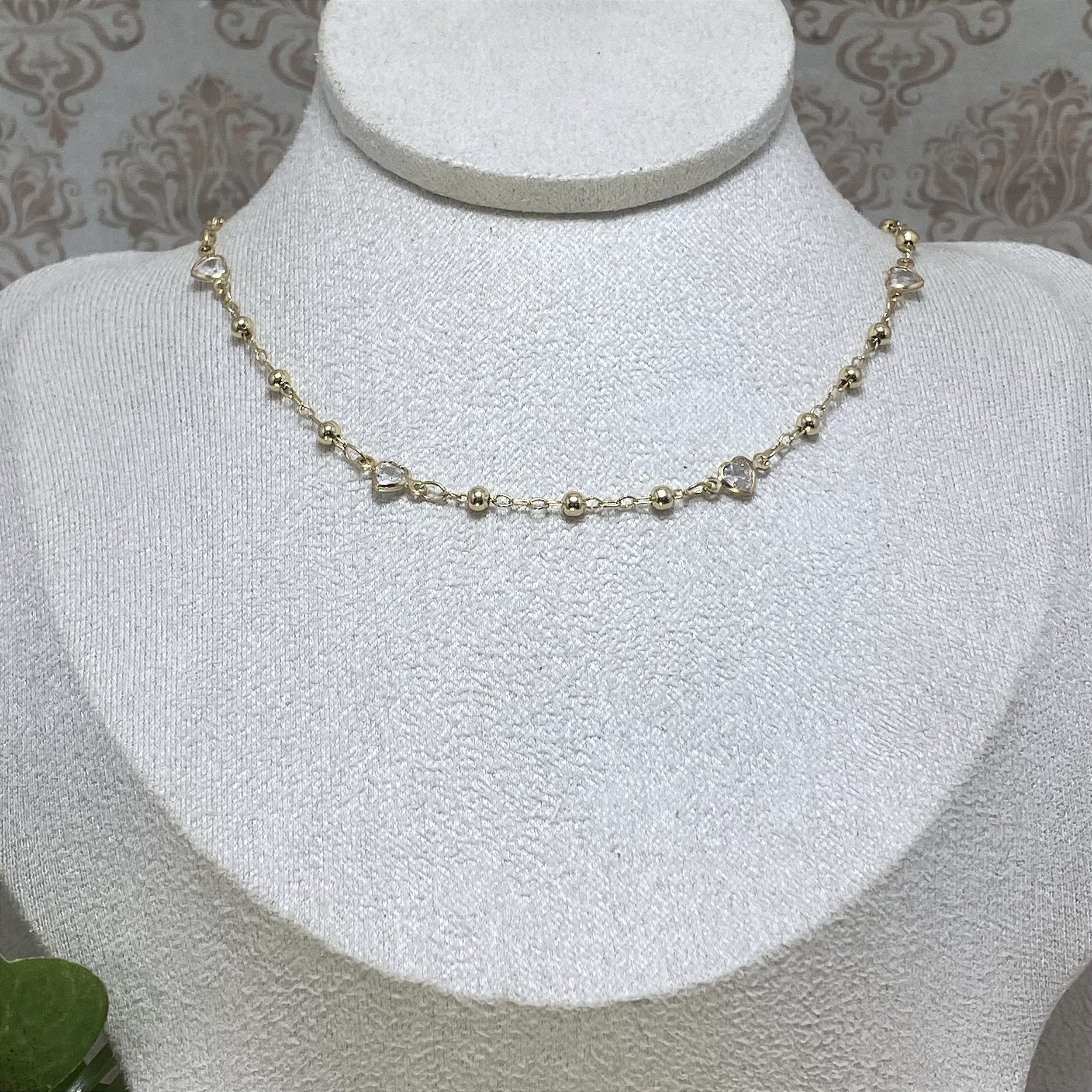 Colar Bolinhas e Corações Cristal Semijoia Ouro