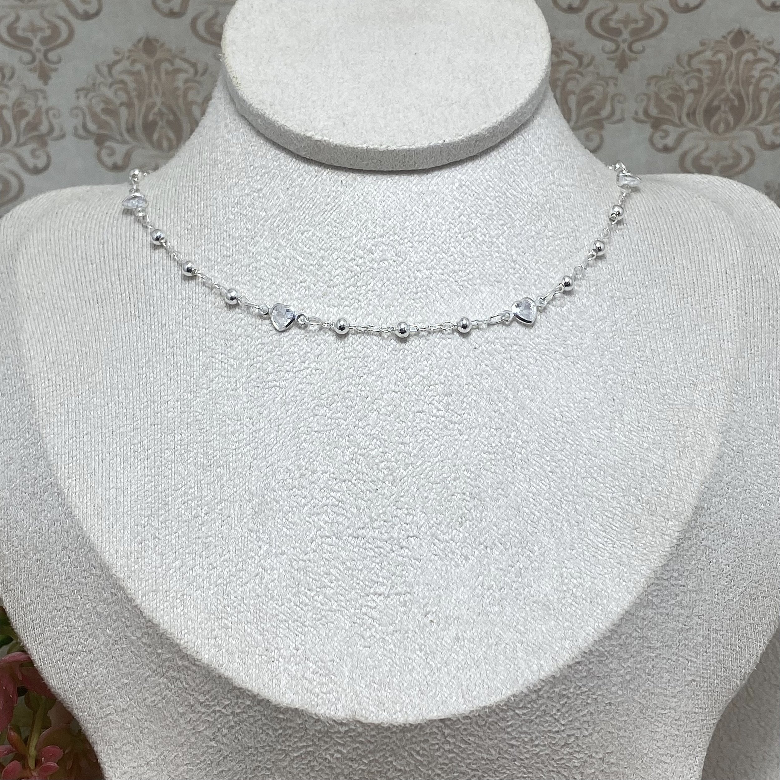 Colar Bolinhas e Corações Cristal Semijoia Prata