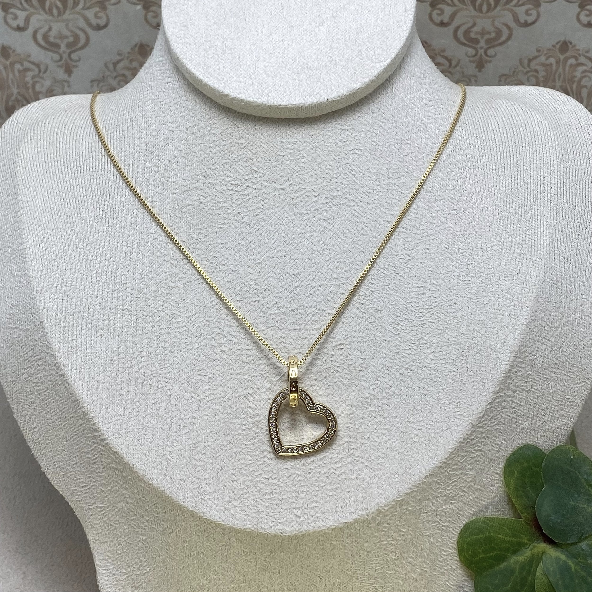 Colar banhado a Ouro 18k, com pingente de elo escrito LOVE e com coração cravejado de zircônias.