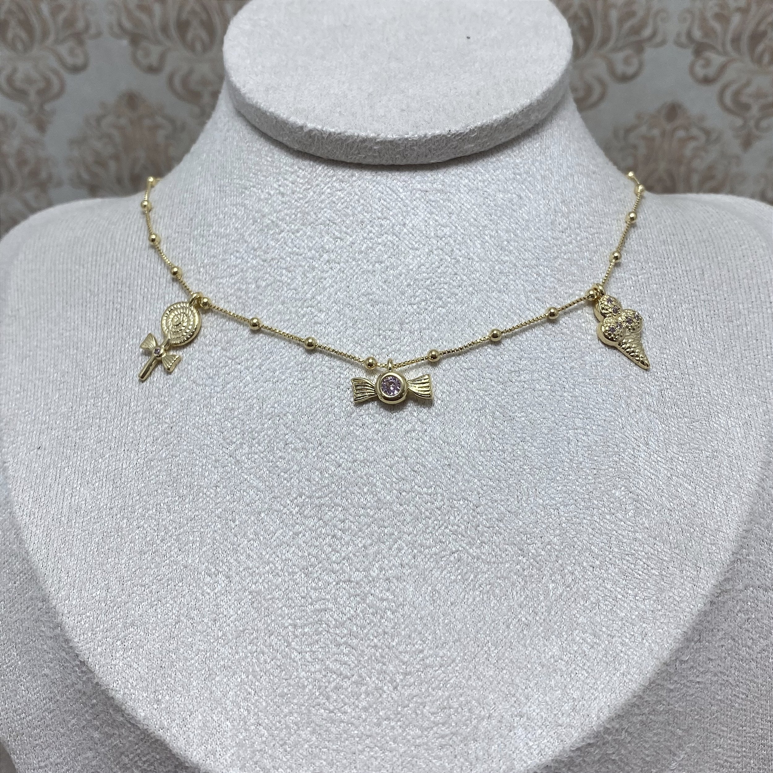 Colar Infantil banhado a Ouro 18k, de bolinhas com pingentes de docinhos (pirulito, bala e sorvete) com cristais cor-de-rosa.