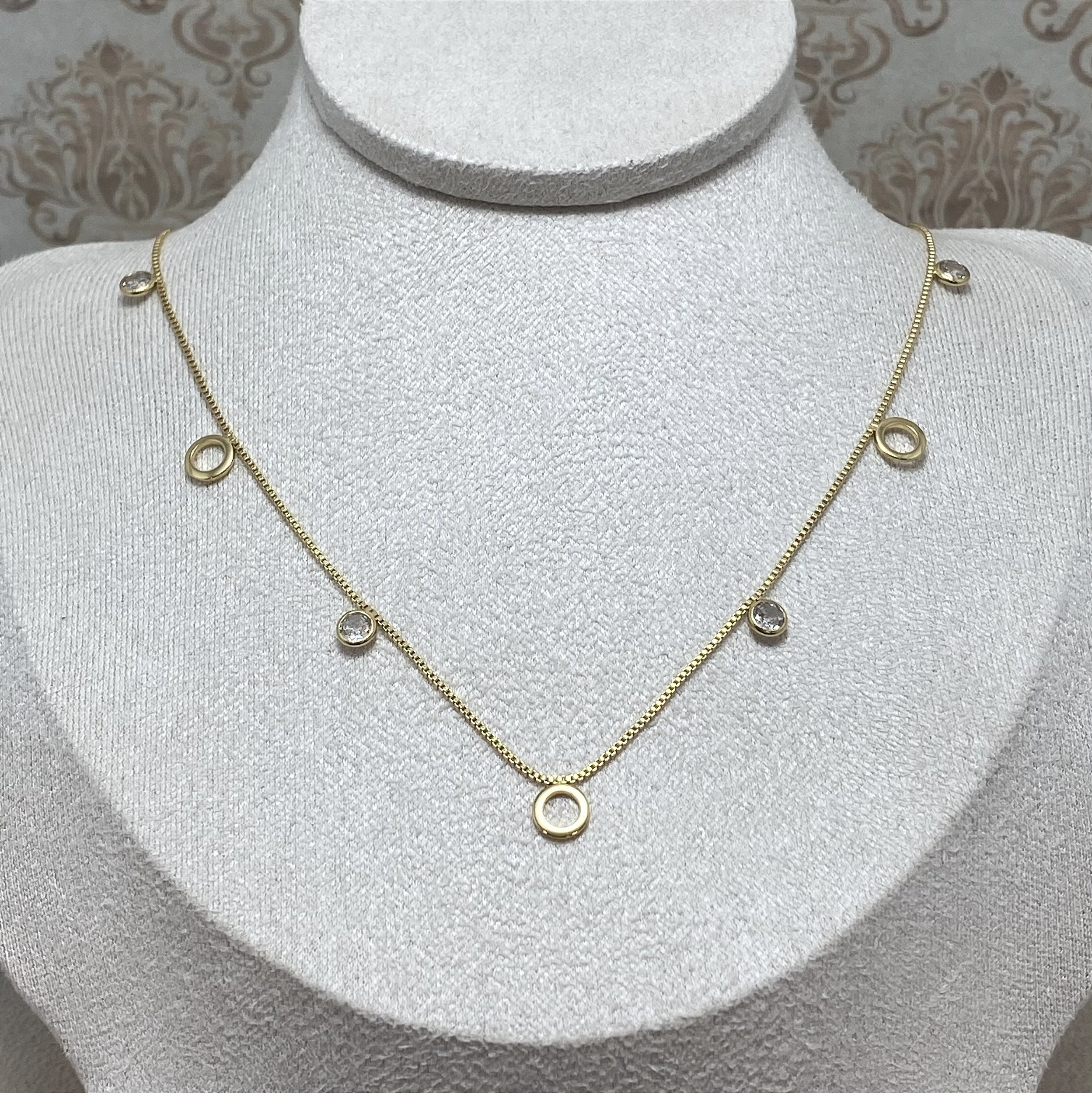 Colar Longo, banhado a Ouro 18k, com pingentinhos de círculos e zircônias.