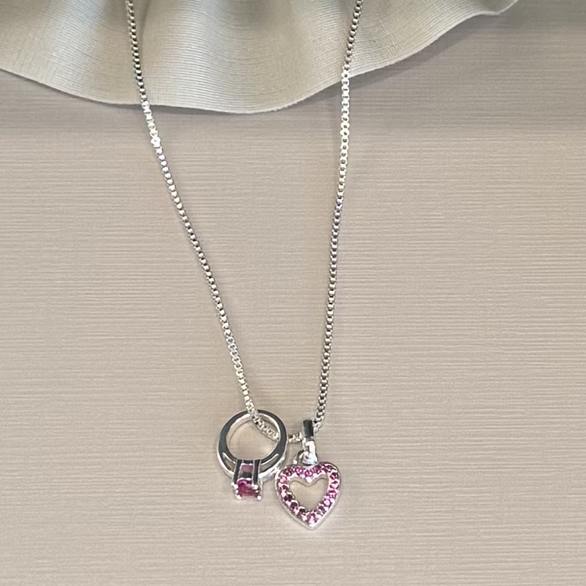 Colar banhado a Prata 925, com pingentinhos de coração cravejado de zircônias rubi e anel solitário também com zircônia rubi.