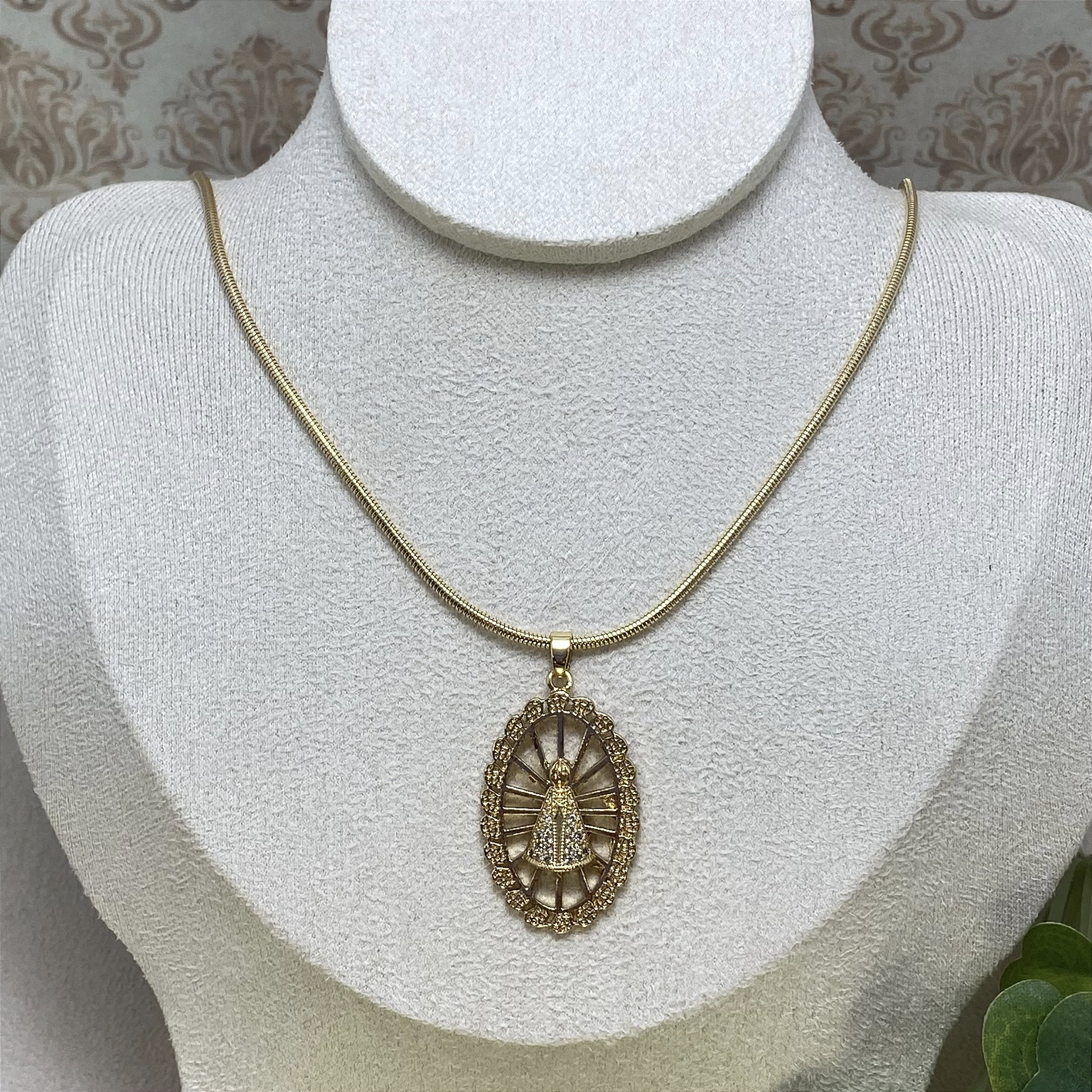 Colar Pingente Nossa Senhora Aparecida, Cravejado Microzircônias, Banhado a Ouro 18k, com Corrente Rabo de Rato.