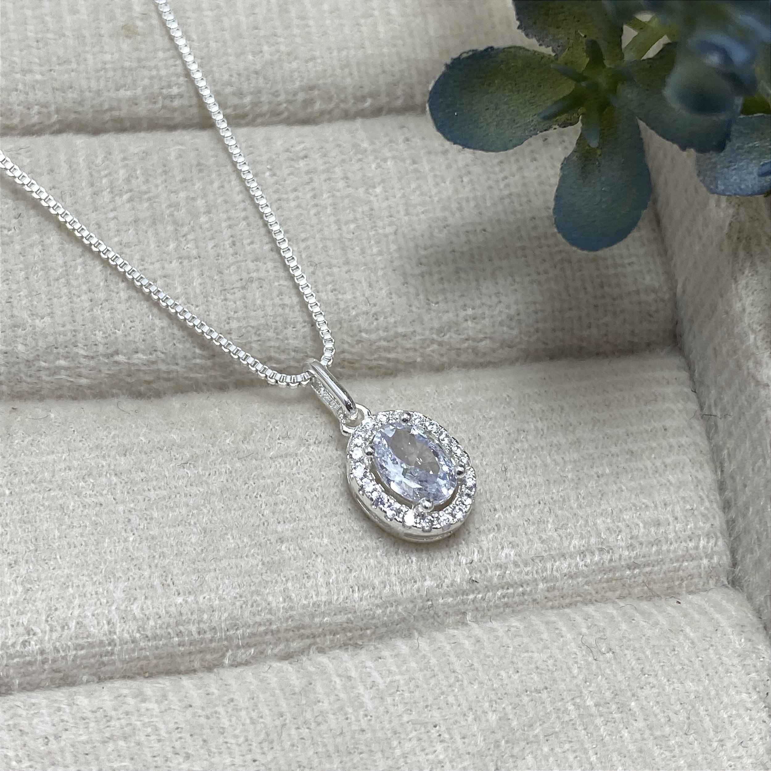 Colar banhado a Ouro 18k, com pingente oval com uma zircônia oval e moldura de zircônias menores.
