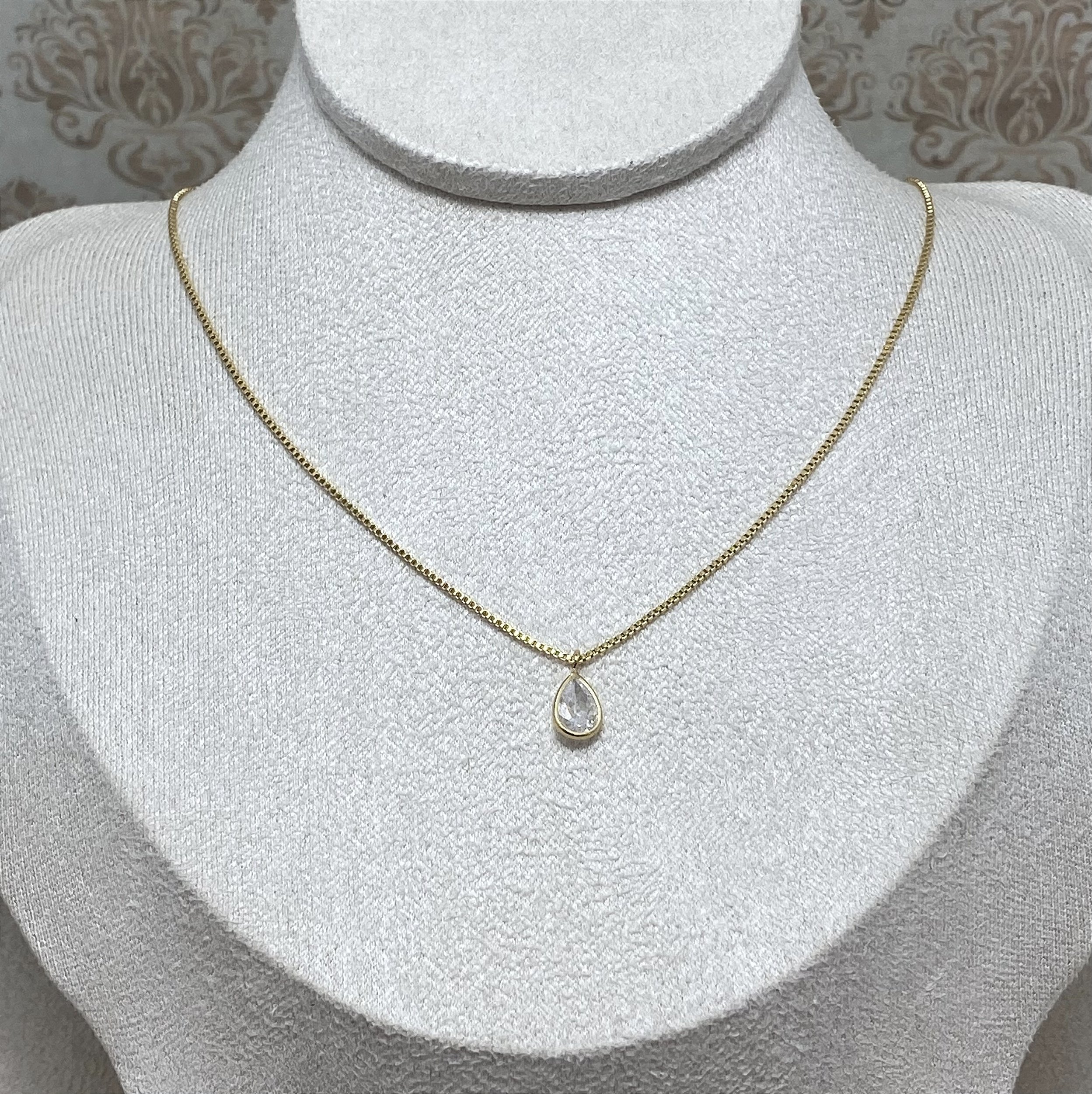 Colar Ponto de Luz banhado a Ouro 18k, com correntinha veneziana e ponto de luz de zircônia em forma de gotinha.