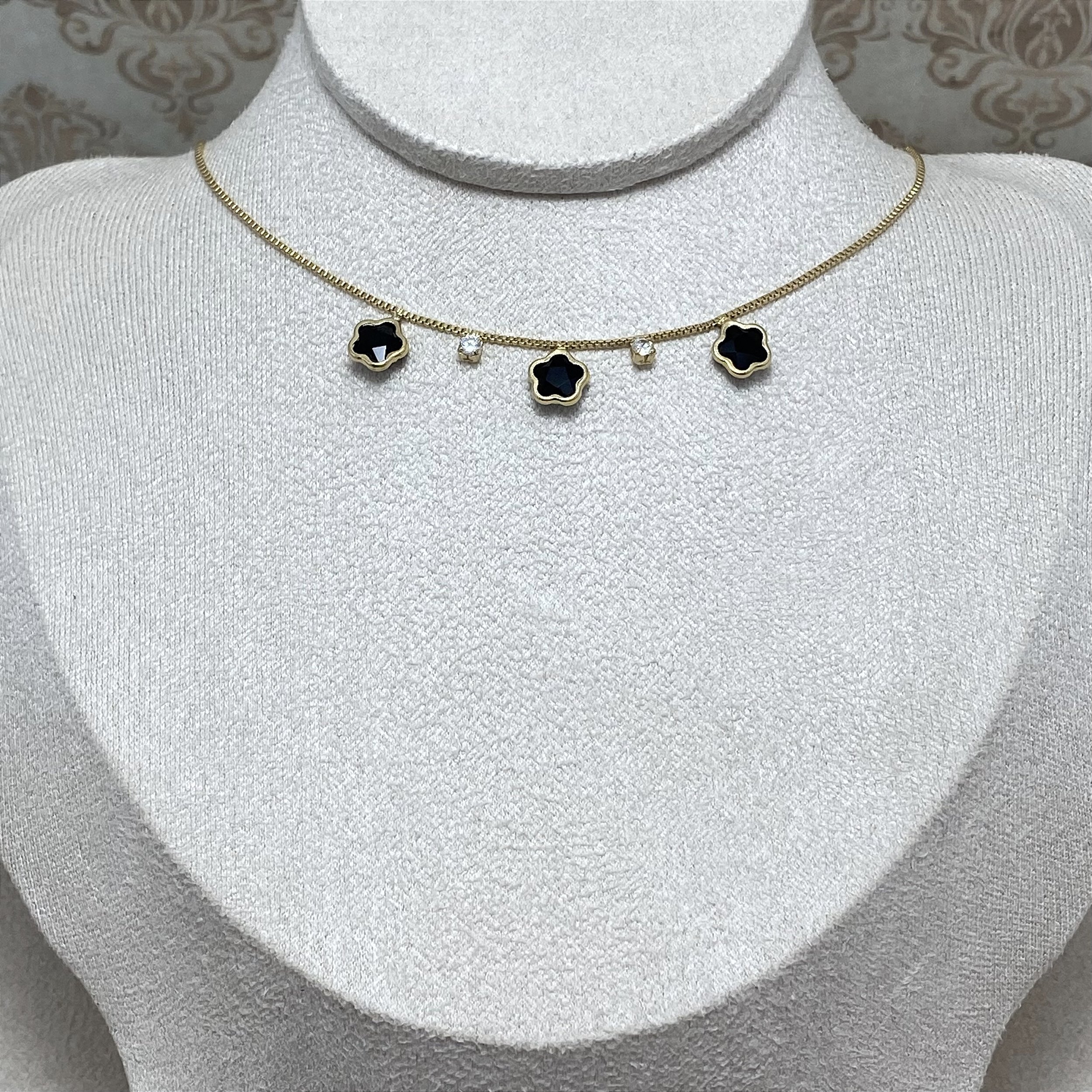 Colar banhado a Ouro 18k, de trevinhos pretos e zircônias.