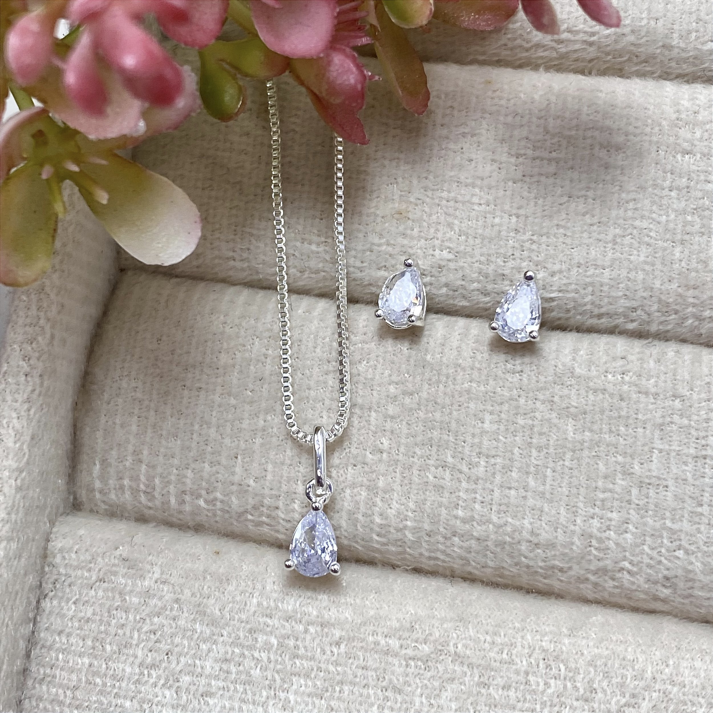 Delicado Conjunto de Colar e Brincos, de Gotinha Ponto de Luz, em zircônia cristal, banhado a Prata 925.