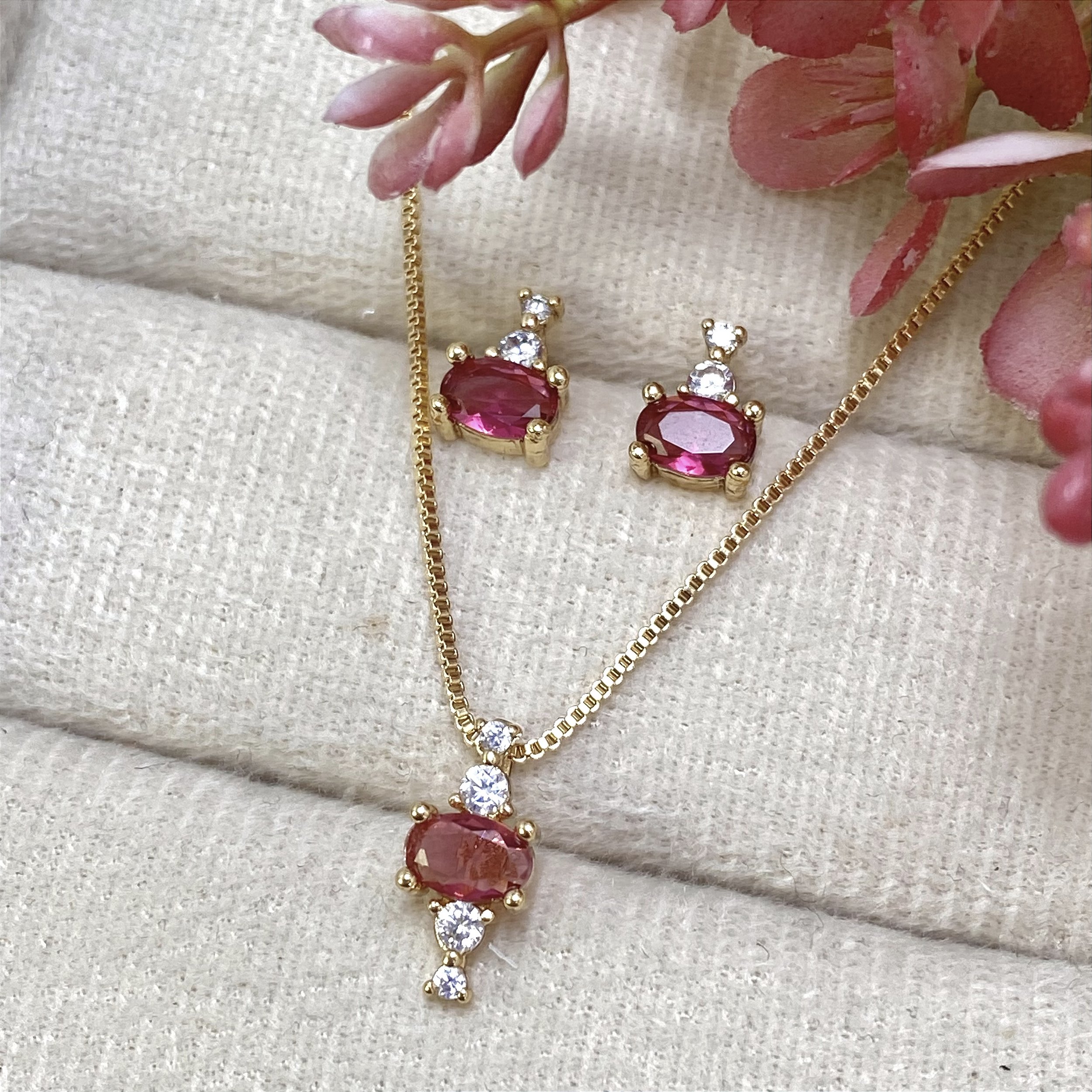 Delicado Conjunto de colar e brincos de cristal Rubi e zircônias, banhado a Ouro 18k.