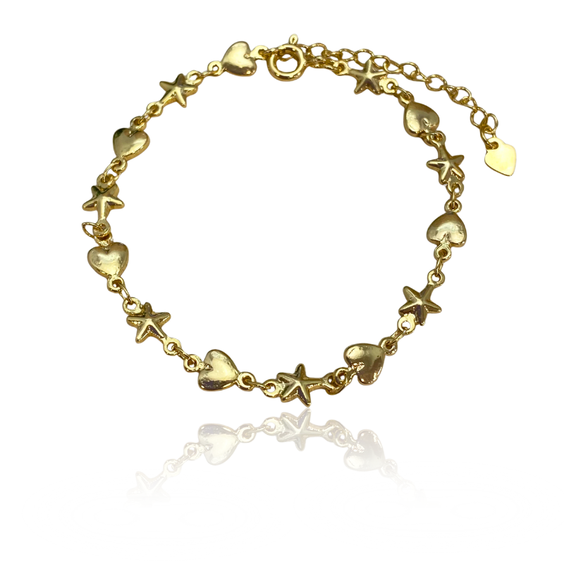 Pulseira Coração Estrela Enfileirados Semijoia Ouro