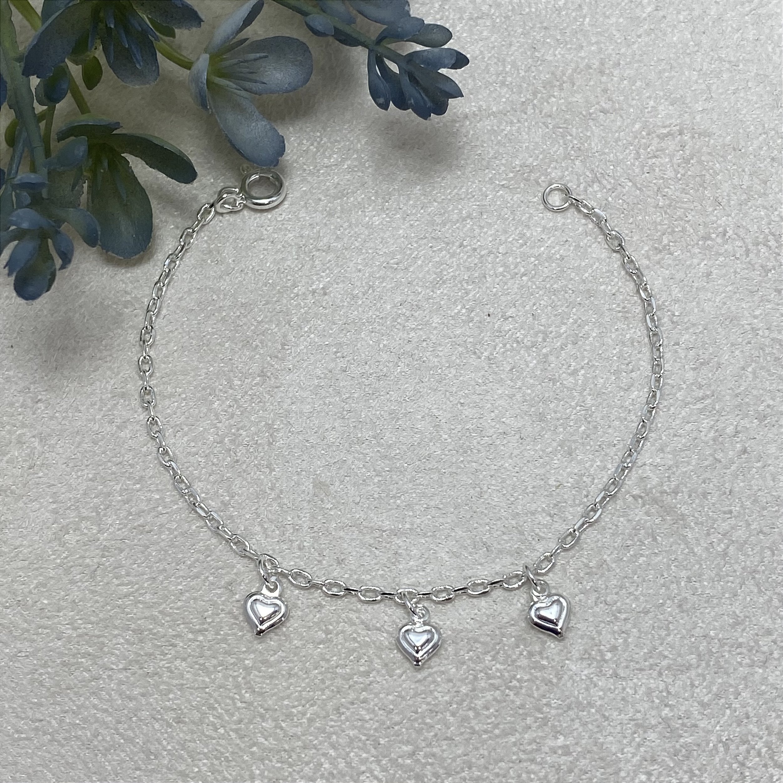 Pulseira Infantil banhada a Prata 925, com 3 pingentinhos de Corações.
