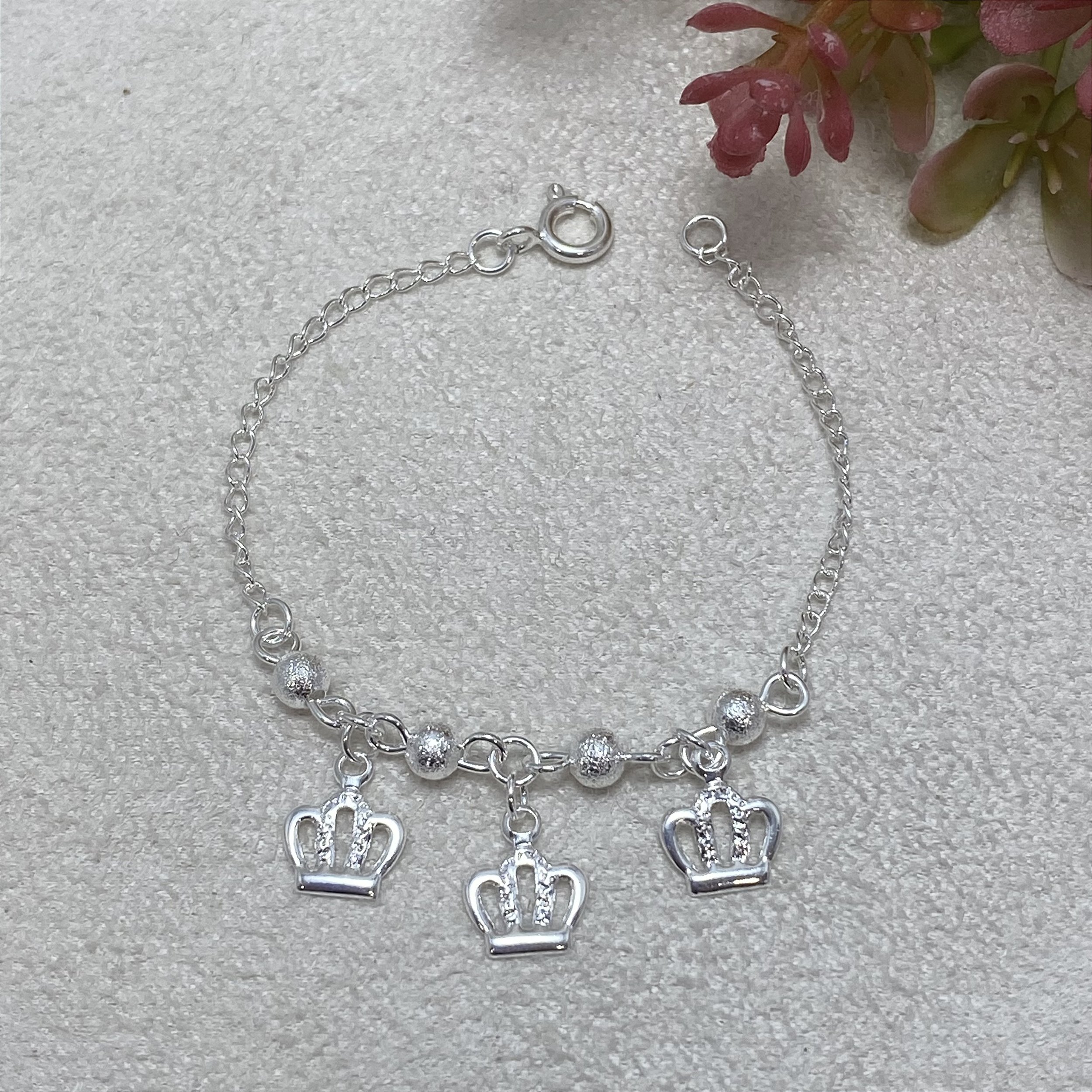 Pulseira Infantil, banhada a Ouro Prata 925, com bolinhas e delicadas coroas.