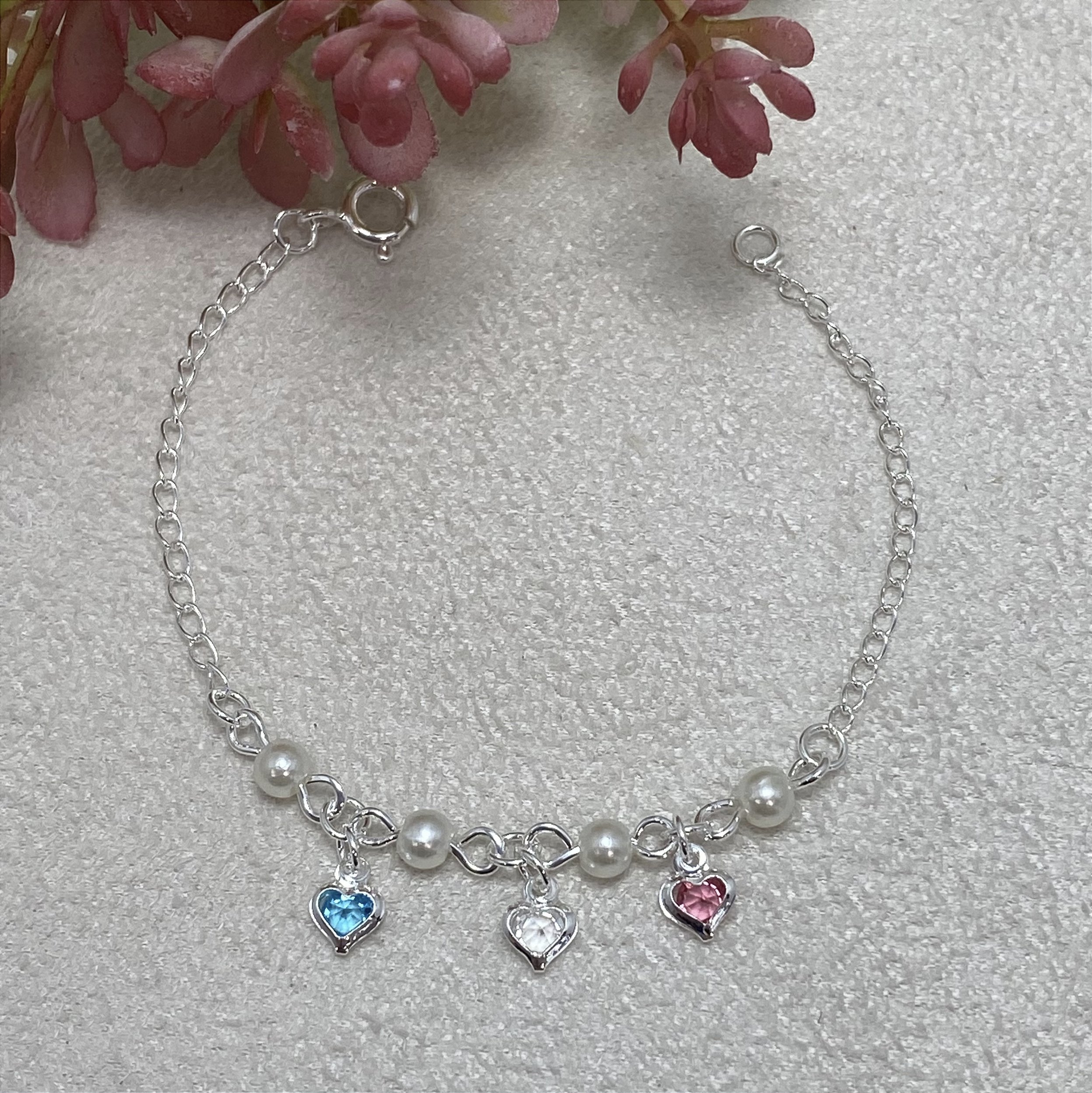 Pulseira Infantil banhada a Prata 925, de perolinhas e pingentinhos de corações coloridos.