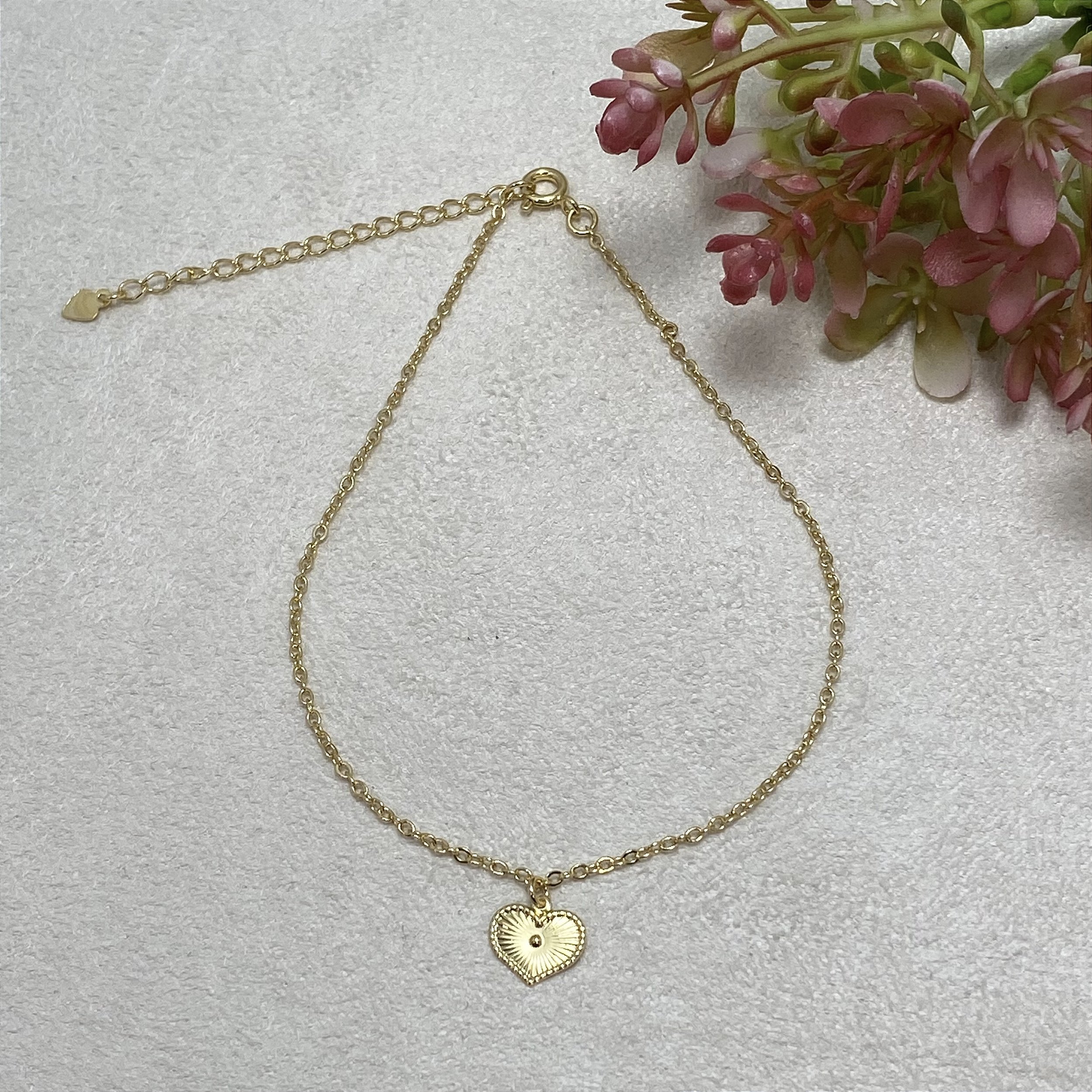Tornozeleira banhada a Ouro 18k, com correntinha e pingente de coração.