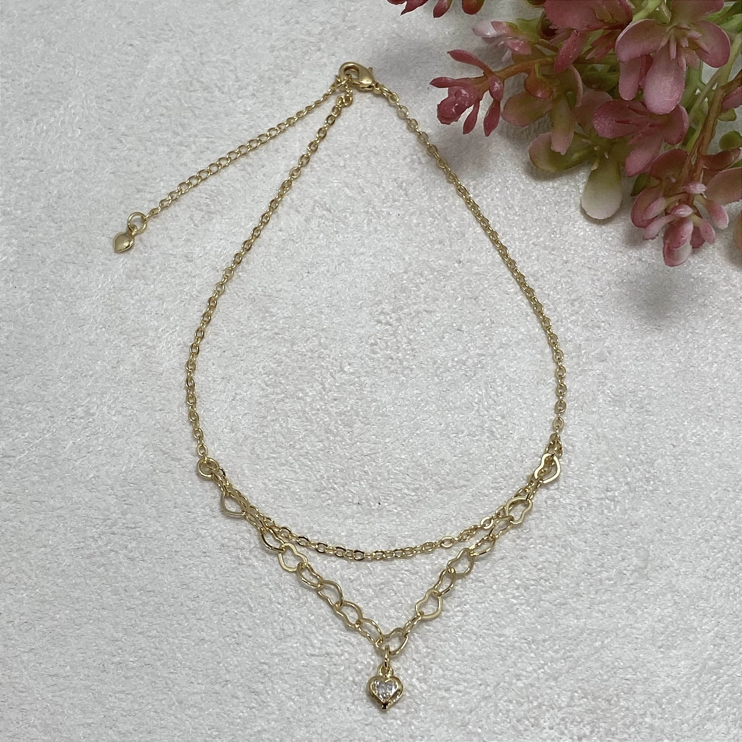 Tornozeleira banhada a Ouro 18k, com correntinha dupla e pingente de coração de zircônia.