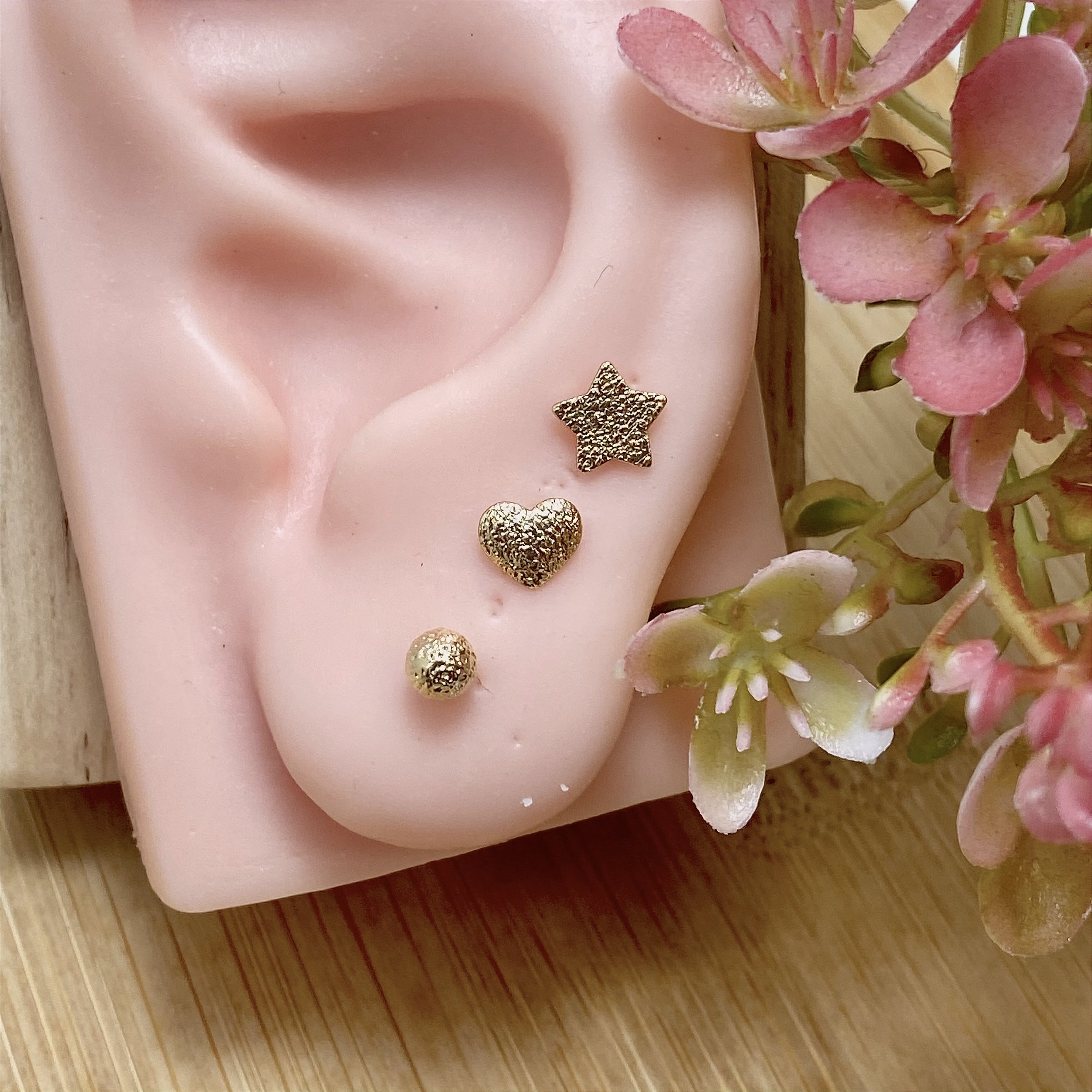 Trio de brincos banhados a Ouro 18K, em forma coração, estrela e bolinha marteladinhos.