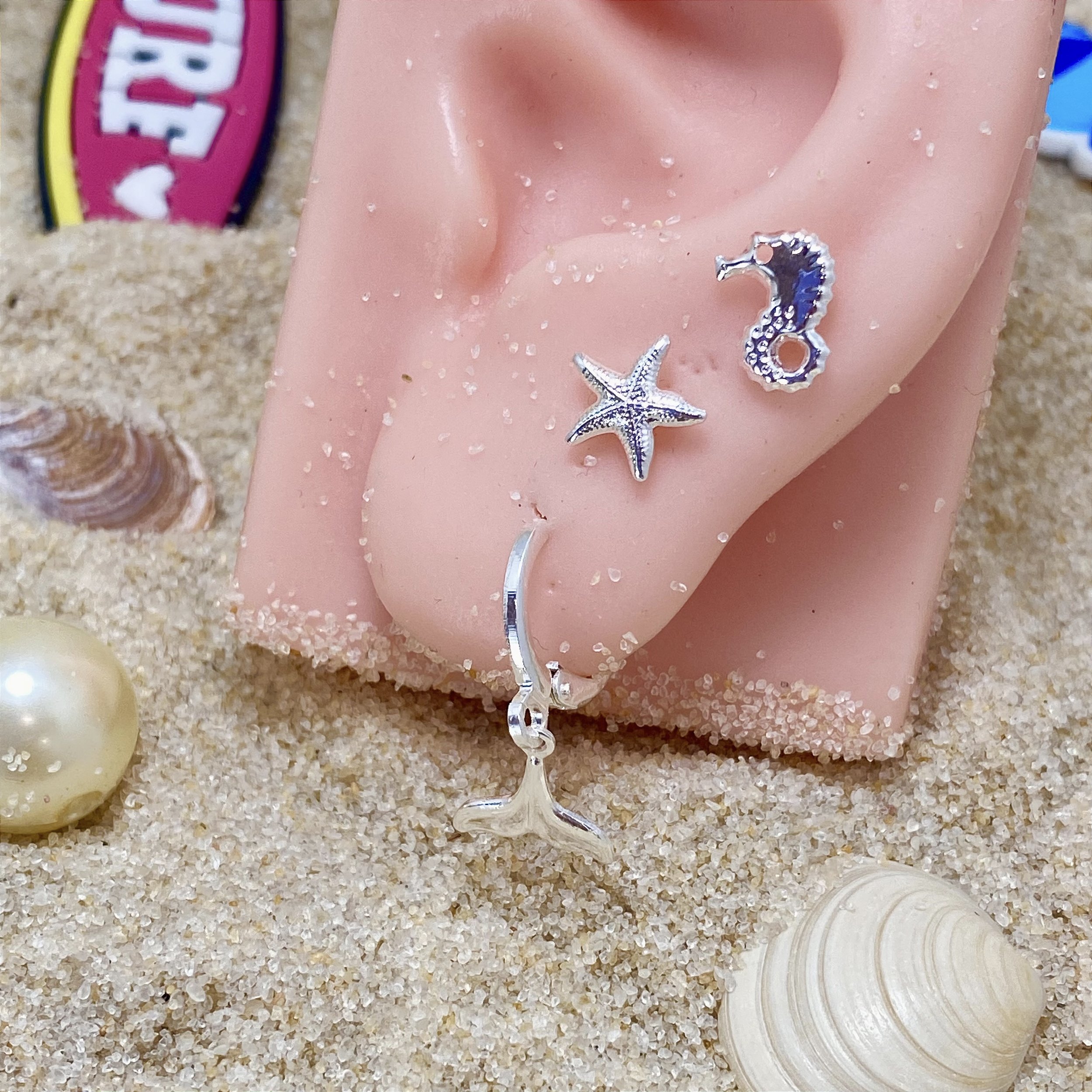 Trio de brincos banhados a Prata 925, em forma estrela do mar, cavalo marinho e argolinha de rabo de baleia.