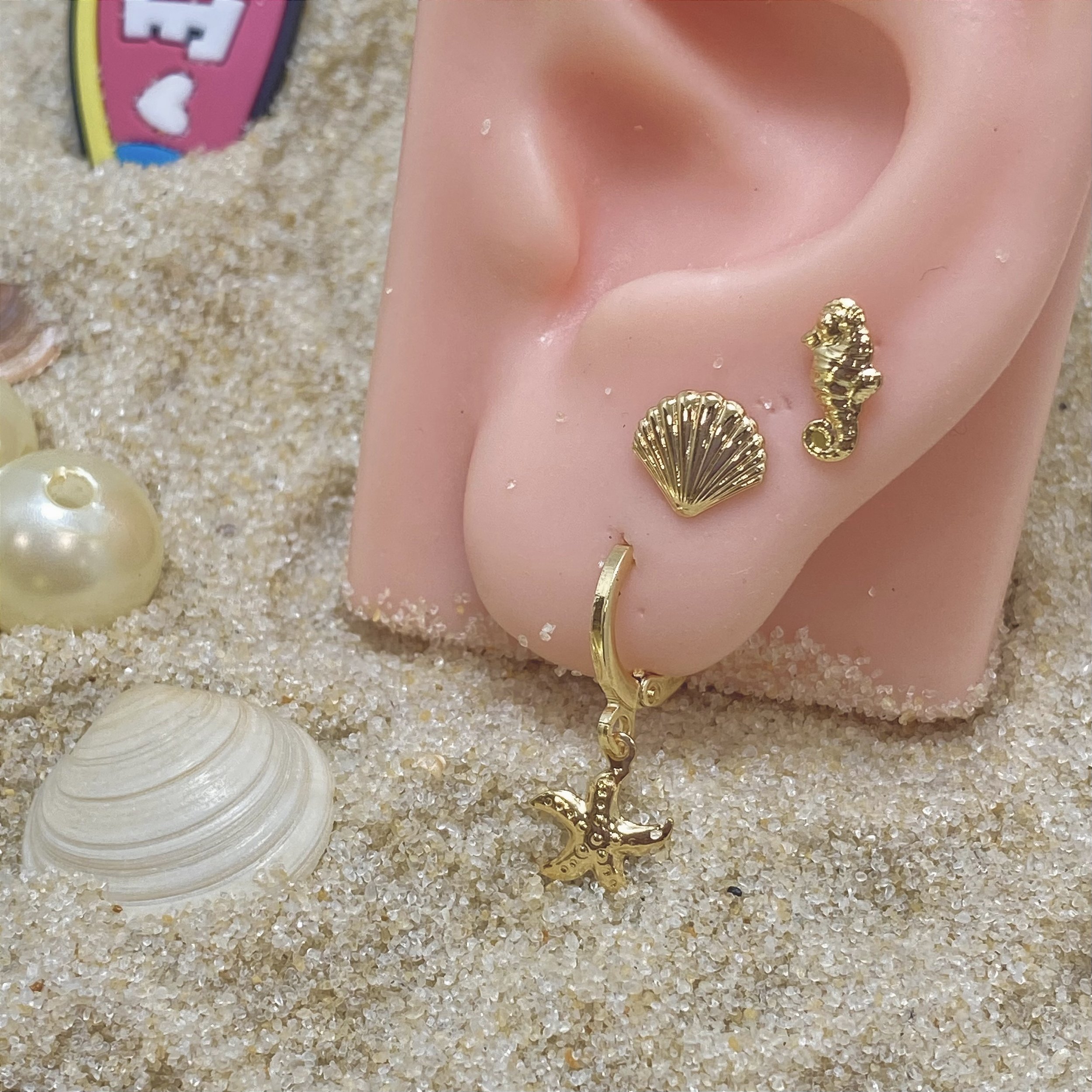 Trio de brincos banhados a Ouro 18K, em forma concha, cavalo marinho e argolinha de estrela do mar.