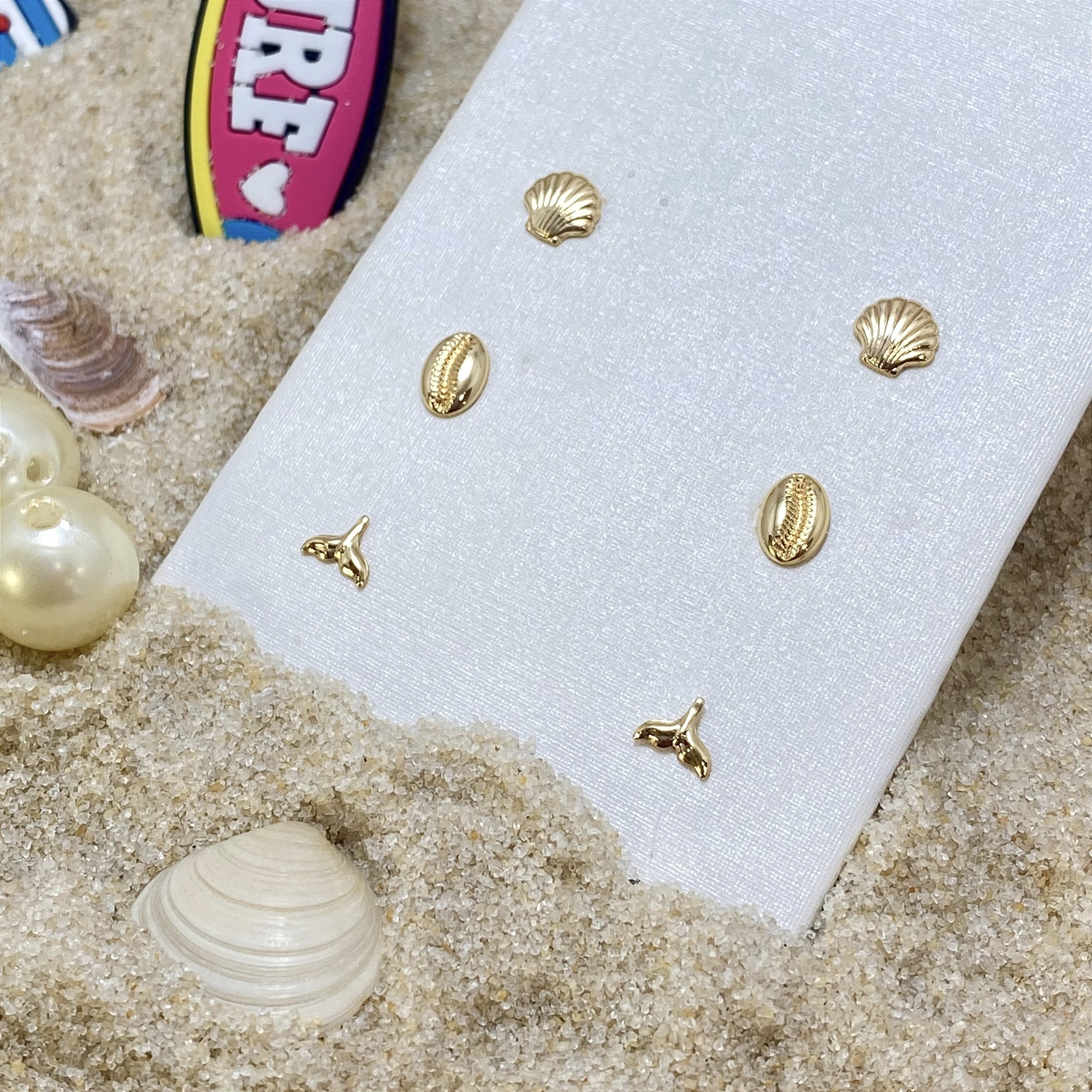 Trio de brincos banhados a Ouro 18k, em forma concha, búzios e de rabo de baleia.